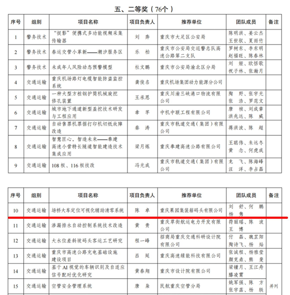 11月26日,由共青团重庆市委联合市发改委、市科学技术局、市经济和信息化委员会等11个部门和单位发布文件,通报表扬第九届重庆市“五小”创新晒暨优秀项目推介展示交流系列活动获奖团队。果园集装箱公司团委选送的“场桥大车定位可视化辅助清零系统”项目荣获二等奖,这也是该司团委首次参加市级竞赛并取得的“开门红”。